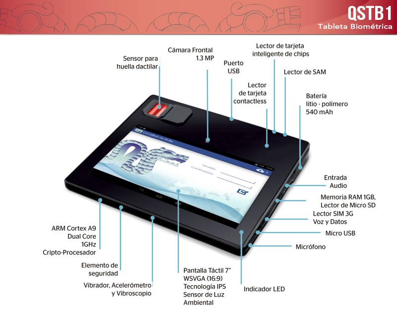 Tableta Android con sensor óptico de huellas dactilares Biométricos certiicados por el FBI (PIV IQS) y el STQC Funciones criptográficas y de administración segura Lectores de tarjetas inteligentes con o sin contacto incorporados, incluyendo NFC Comunicación a través de redes móviles, WiFi y Bluetooth