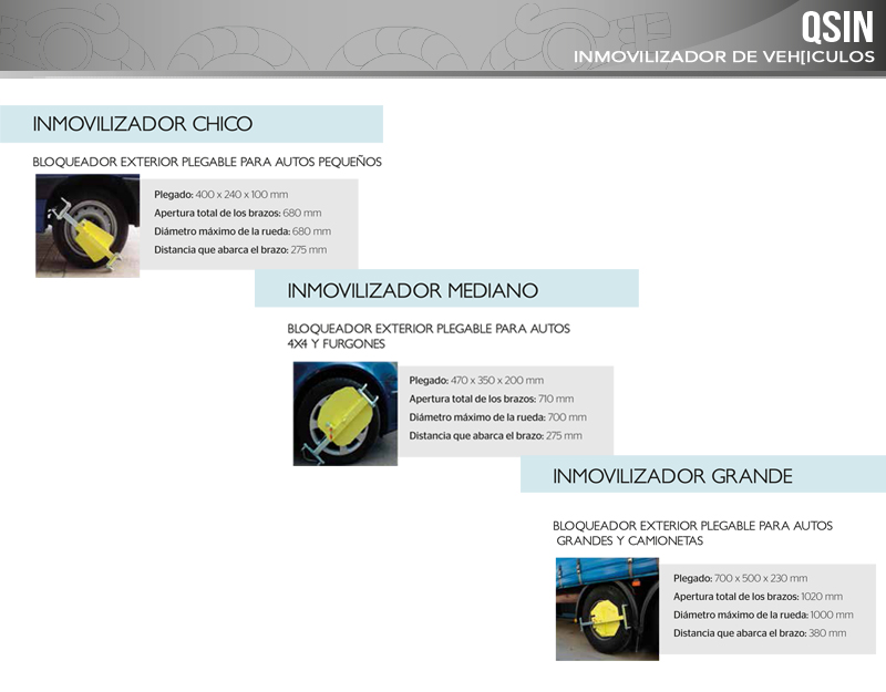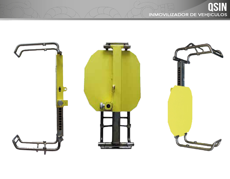 QSIN es un inmovilizador para vehículos de fácil transporte y de tamaño reducido, diseñado minuciosamente para evitar todo tipo de manipulación e intento de escape.El sistema funciona mediante varios elementos de bloqueo y un brazo que alcanza a inmovilizar por completo una llanta del vehículo, impidiendo su desplazamiento